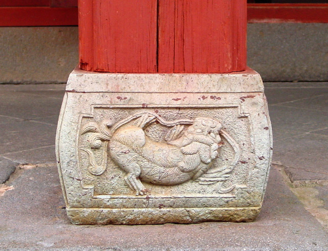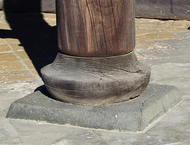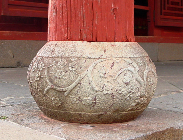 Also sōban 双盤. A cushion or footing stone with a concave upper part and a convex lower part placed between the bottom of a pillar and the base stone *soseki 礎石. Soban were introduced during the 13th century as a part of the Zen style *zenshūyō 禅宗様. The cushion or footing is sometimes made of wood. Early soban were not very thick and did not project too far beyond the girth of the pillar. Later soban were thicker and occasionally the base and cushion stones were carved as a single piece. During the Edo period, some soban were set on angled or box-like base stones. Decoration was sometimes carved into the top. Examples of this type can be found at Manpukuji 萬福寺 in Kyoto. and at Sōfukuji 崇福寺 in Nagasaki Prefecture.