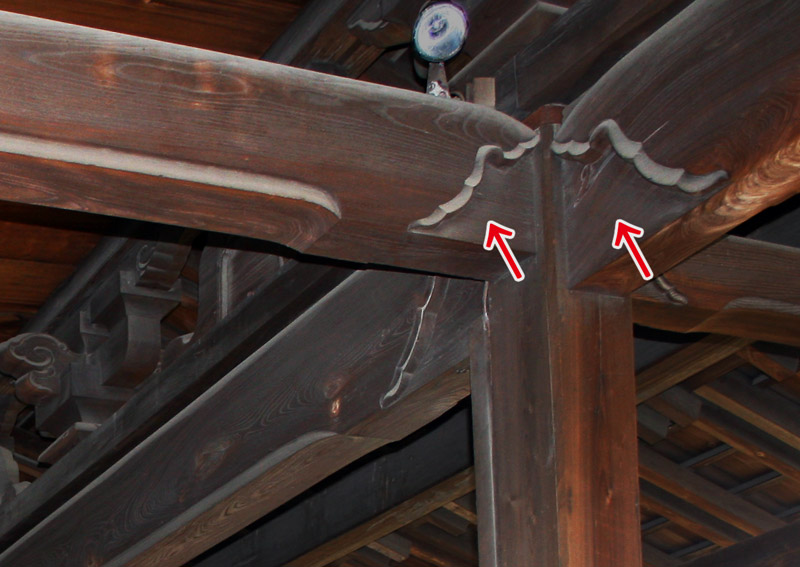 The process by which the diameter of the ends of large rainbow beams *kōryō 虹梁 were reduced in order to fit into pillars which were sometimes smaller in diameter than the rainbow beams themselves. The ends of the beams were narrowed by rounding them off and the surfaces were left undecorated. From the latter part of the 13th century onward, with the introduction of the Zen style *zenshūyō 禅宗様 and daibutsu style *daibutsuyō 大仏様, the ends of the rainbow beams were cut diagonally from the sides to form a triangular shape called sodekirimayu 袖切眉. The upper, long side of the triangular shape was decorated with a bow-like incised line called *yumimayu 弓眉 and by an incised scroll shape.