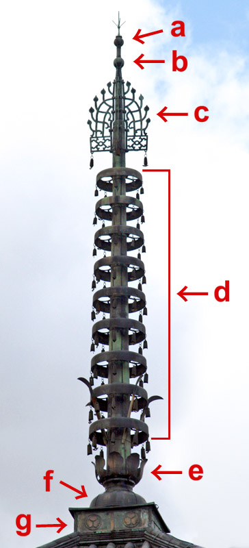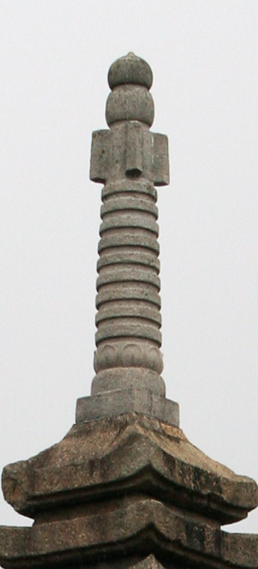 Lit. "pagoda finial." The vertical shaft which protrudes from the top of a pagoda. The sōrin, whether made of bronze and placed above a wooden pagoda or carved into a stone pagoda *sekitō 石塔, is usually divided into several component parts. At the base are the dew basin *roban 露盤, and the inverted bowl *fukubachi 伏鉢; next are the nine rings *kurin 九輪 surmounted by the water flame *suien 水煙; above that is the dragon wheel *ryūsha 竜車 (not found on sekitō) topped with the sacred gem *hōju 宝珠.