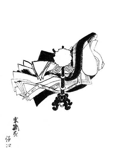A pictorial subject matter based on "Suetsumuhana" ("Safflower"), Chapter 6 of Genji monogatari 源氏物語 (The Tale of Genji), and the name of that chapter's female protagonist, the penurious but proud daughter of Prince Hitachi 常陸. Genji visits her dilapidated mansion on a spring night.