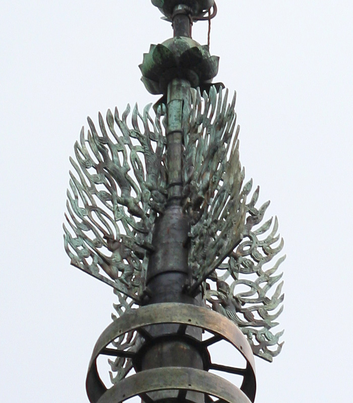 There is considerable variation in the open work design of the suien. The characters mean "water" and "fire" and therefore the suien may have symbolized protection from fire. Originally called kaen 火煙 meaning a blazing flame, but fire had a horrifying connotation for the Japanese, and thus the word kaen was dropped and replaced by suien. Example: Yakushiji Tōtō 薬師寺東塔 (early 8th century) in Nara.