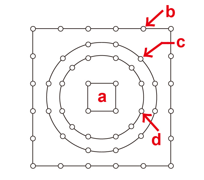 a) *shumidan 須弥壇 b) mokoshibashira 裳階柱 c) suirinbashira 水輪柱 d) moyabashira 母屋柱