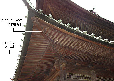 Also called sumidaruki 隅垂木 and ōdaruki大垂木. A hip rafter or corner rafter that forms a diagonal ridge which slopes downward from the main ridge *munagi 棟木 to the corner posts *sumibashira 隅柱 of a building. Hip rafters form the main frame of a hipped roof *yosemune yane 寄棟屋根, and established the eave curvature. If the roof is a hip-and-gable type *irimoya yane 入母屋根, the hip rafters run from the gable ends to the corner pillars. Hip rafters are larger in cross section than ordinary rafters *taruki 垂木, and are usually set at a 45 degree angle. Hip rafters receive the inner ends of rafters and the ends of purlins *keta 桁. The flying rafter support *kioi 木負 and eave support *kayaoi 茅負, are also attached to the hip rafters. They give definition to the characteristic curvilinear line of the eaves.