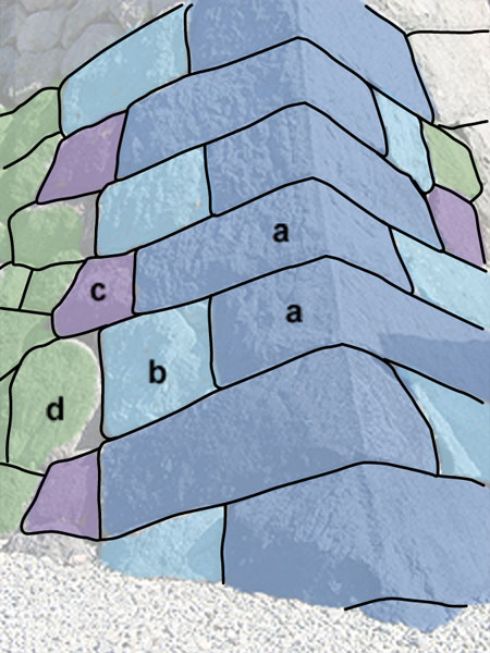 Such corner stone groupings are termed sangizumi 算木積, seirōzumi 井楼積 or iketazumi 井桁積. The way the stones are laid fuseyō 伏せ様 in these corner groupings is categorized as formal shin 真, less formal gyō 行, and informal sō 草. For example, a formal sumi-ishi grouping is comprised of one corner stone joined with two or three corner side stones, carefully hewn and fitted in a row. The corner stone grouping supports the stone wall, so the size, number and placement of the sumi-ishi and other stones is carefully calculated, a process called ishigumi ishibakari 石組石図り. See the drawing for the names of the various components of the corner of a stone wall. Contrast sumi-ishi with flat stones *hira-ishi 平石, the other main type of stone used for stone facing.