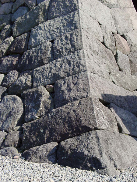 Also read kado-ishi 角石. Lit. "corner stone." Long, rectangularly-hewn stones laid horizontally at the corners of a stone wall *ishigaki 石垣. For high stone walls, hard stone is used and joined in a zipper pattern along the ridge at the corner of the wall. The size and number of the corner stones is determined by the overall height of the stone wall. The corner base stone is called sumikadobu ne-ishi 隅角部根石; the first corner stone above that is called ichiban sumi-ishi 一番隅石, the next stone is niban sumi-ishi 二番隅石 and the next is sanban sumi-ishi 三番隅石. The sumi-ishi is the main component of a corner stone grouping, along with *sumijiri-ishi 隅尻石 (corner tail stones), and sumiwaki-ishi 隅脇石 (corner side stones).