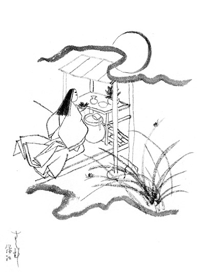 A pictorial subject taken from "Suzumushi" ("The Bell Cricket"), Chapter 38 of Genji monogatari 源氏物語 (The Tale of Genji). Suzumushi means a bell cricket (Homoeogryllus japonicus), though in the Heian period the same term was used for what today is called a pine cricket matsumushi 松虫 (Xenogryllus marmorata).