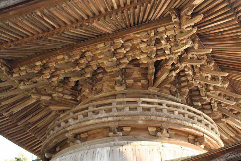In the earlier periods, bracket complexes used stop the square pillars or in rare instances of circular pillars, were the simple 3-on-1 type *mitsudo tokyō 三斗斗きょう. When circular pillars superseded the use of square ones, 1-stepped bracket complexes *demitsudo 出三斗, or 2-stepped *futatesakigumi 二手先組, were employed atop the pillars to extend the supporting strength for the pent roof. On top of white bun-shaped kamebara there was a circular railing most often supported by unstepped bracket complexes. 4-stepped brackets *yotesaki tokyō 四手先斗きょう, support the deeply extended eaves *noki 軒. In no other type of building has the consistent used of 4-stepped bracket complexes prevailed. Most of the bracket complexes are wayō style *wayō 和様, but exceptions where Zen style complexes can be seen are at Hōdōji 法道寺 Tahōtō (1368) in Osaka; Mitsuzōin 密蔵院 Tahōtō (Muromachi period), Tōkannonji 東観音寺 Tahōtō (1528), and Kannonji 観音寺 Tahōtō (1536) in Aichi Prefecture; and Shōman'in 勝鬘院 Tahōtō (1597) in Osaka.