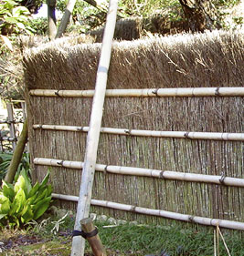 Lit. "bamboo fence." A generic name for any kind of fence made with bamboo. Specific types include *yotsumegaki 四目垣 and *kenninjigaki 建仁寺垣. Fences made with bamboo ears are called takehogaki 竹穂垣.