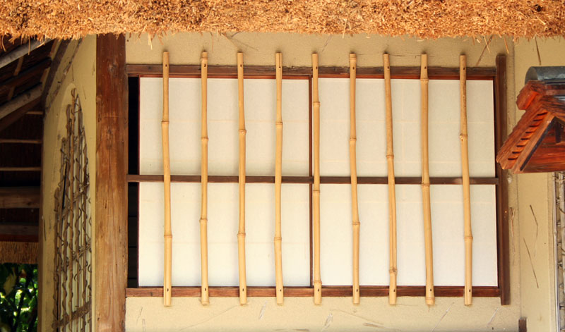Bamboo or bamboo muntins that are used for windows in dwellings where a suggestion of rusticity is needed, or in tea ceremony houses *chashitsu 茶室. Five, seven or nine pieces of bamboo are arranged vertically with 10-15 cm spaces in between, depending on the size of the opening. Various methods are used to attach them: they are nailed to the outside of the sill *shikii 敷居 and head jamb *kamoi 鴨居; they are inserted into holes at the top and bottom on the inside side surfaces *uchinori 内法; the bottoms of the bamboo lath are inserted into holes in the sill while the tops are nailed into the head jamb. If the bamboo laths are nailed into the head jam without spaces in between them, they are called tsumeuchi 詰打 or *urakumado 有楽窓.