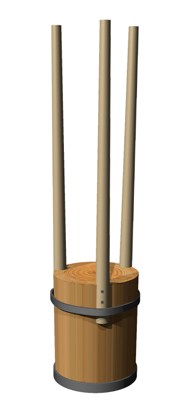 A tool called a "punner" in English, used to pound down broken stones laid below the foundation of a building. It consists of a piece of zelkova wood 300-400 mm in diameter, and 350-450 mm high. There is an iron ring attached to the end, and two or three rods about 80 cm long which are fixed at even distances around the circumference. These rods allow several people to lift a tako and drop it to ram down broken stones. The tako weighs between 18 and 37 kg. This work is now largely done by electrically powered machines.