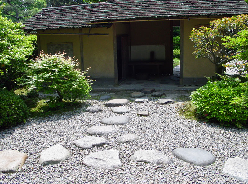 It is generally thought that tobi-ishi came to be used from the time of Sen no Rikyū 千利休 (1522-91), who supposedly used stepping stones in roji where moss or dirt path was likely to be muddy after rain. There are many ways of arranging stepping stones; the most common being the chokuuchi 直打 (straight line), niren'uchi 二連打 (two stone set), sanren'uchi 三連打 (three stone set), *goren'uchi 五連打 (a five stone set) made up of the former two types, shichi-go-san 七五三 (seven, five, three stone pattern), shisankuzushi 四三崩 (a three and four stone set) in a zig-zag pattern *chidorigake 千鳥掛 an alternate stone zig-zag pattern *gan'uchi 雁打 (the flying geese or extended zig-zag pattern), konohauchi 木の葉打 (fallen leaves), and tanzakuuchi 短冊打 (the oblong stone set). Tobi-ishi are generally 6 cm from the ground in the Rikyū style, 5 cm in the Oribe 織部 style, and only 3 cm in the Enshū 遠州 style.
