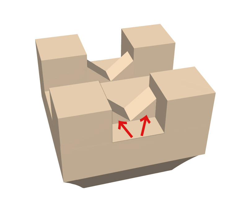 Also called masudasuke, tosuke; totsunagi 斗繋. The reinforcement pieces cut into some types of bearing blocks. When the upper part of a large bearing block *daito 大斗 or square bearing block is hewn to form a square-cross shape. Four upright blocks remain, one at each corner which structurally weaken the bearing block. To overcome this, triangular pieces are left uncut in two facing cuts. Sometimes an extra cross-shaped plate is cut into the block, each end being slightly shorter than the cuts in the block. The *wakuhijiki 枠肘木 is cut in mirror-image form so that when inserted, its parts will fit snugly into strengthening parts on the daito.