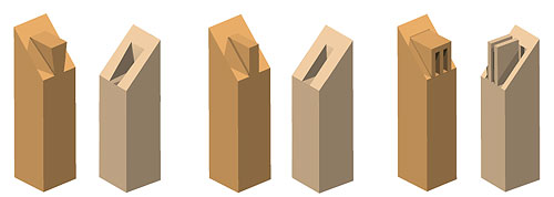 A simple miter. The timbers are cut obliquely, usually at 45 degrees, or any other angle as long as the two adjoining timbers share the angle equally. Because a simple mitered corner joint lacks strength, various types of mortises and tenons *hozoana ほぞ穴, *hozo ほぞ are used to increase durability and prevent separation of the parts.