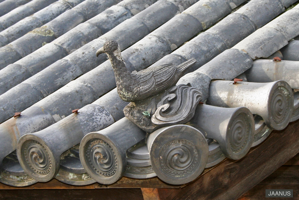 Also called tomebuta 留蓋; amabutagawara 雨蓋瓦; sumibutagawara 隅蓋瓦. A cover tile, usually hemispherical but sometimes square, used to prevent roof leaks where three tiles come together near the end of the corner of a roof. The three tiles are: 1) hanging tiles *kakegawara 掛瓦, i.e. those which are laid at right angles to the bargeboard *hafu 破風 and protrude beyond its edge. 2) the corner tile or hip tile *sumidomoe 隅巴 at the end of a corner ridge *sumi kudarimune 隅降棟. 3) the convex semi-circular eave-end tile *nokimarugawara 軒丸瓦 with pendant *gatō 瓦当 attached. The sleeve tiles *tonemarugawara 利根丸瓦 or *sodemarugawara 袖丸瓦 border the hanging tiles. Because the tile's sides are of differing lengths, adjustments to their height at the inner ends must be made. This is accomplished by chipping off where necessary in order to fit the three tiles at the corner end against the sleeve tiles. Without a cover tile, rainwater would easily seep through the places where the tiles meet. These are usually made as a set today.