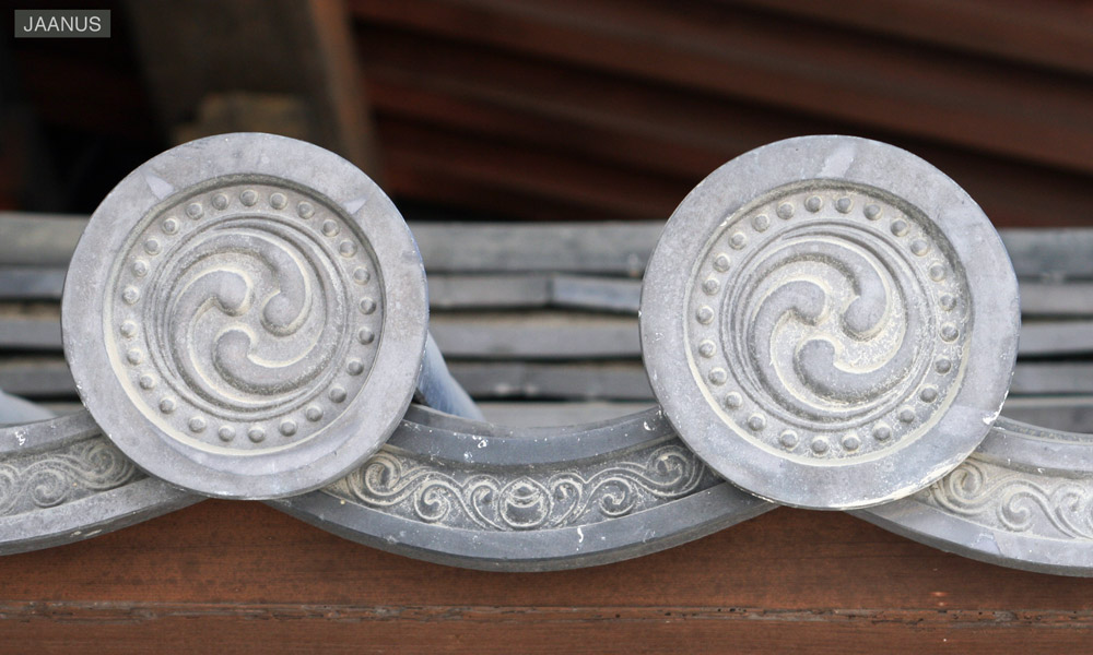 Also nokitomoe 軒巴, *nokidomoegawara 軒巴瓦. A very old expression for tomoegawara was *tsutsumigawara 包み瓦. A half-cylindrical tile with a circular disk attached *nokimarugawara 軒丸瓦. The name of this tile is derived from the disk, which is decorated with a comma pattern *tomoemon 巴文.