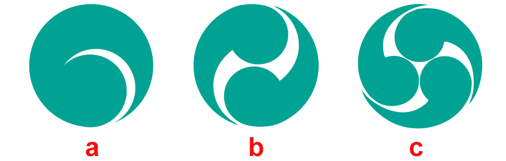 2 A design pattern comprised of one or more spherical head-like shapes each with a connected curving tail-like shape which ends in a point. The character tomoe 巴 means eddy or whirlpool; however, it is not clear if this was the original idea of the design. Some scholars are convinced that it stems from the design on leather guards worn by ancient archers tomo 鞆 thus tomo-e 鞆絵, a tomo picture. Others say it was originally a representation of a coiled snake. It may be the oldest design in Japan, because it is similar in shape to the *magatama 曲玉 jewelry beads of the Yayoi period. It appears as a design on the wall paintings of the Byōdōin *Hōōdō 平等院鳳凰堂 (1053) in Kyoto, and in Genji monogatari emaki 源氏物語絵巻 (Illustrated Handscroll of the Tale of Genji, early 12th century). It was widely used from the Kamakura period onward and is often found on utensils, roof tiles, and family and shrine heraldry. Its frequent appearance in connection with Shinto shrines indicates that it was thought to express the spirit of the gods. Patterns of one, two, and three tomoe exist, some facing left, others right.