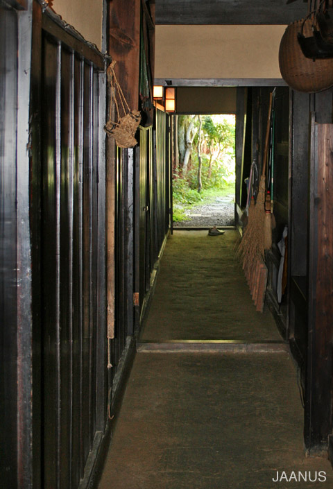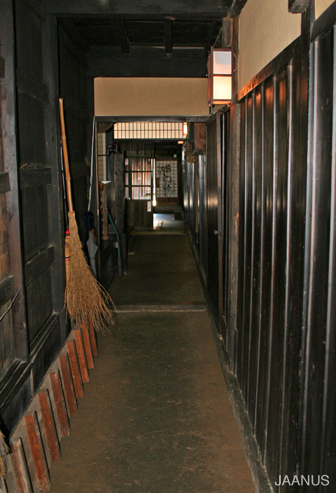 An earthfloored area *doma 土間 or *niwa 庭, which provided access from the front of the house to the rear of the plot in vernacular houses *minka 民家 of the Edo period. The division of the house into an earth-floored area on one side of the plan and an area of living rooms, kyoshitsubu 居室部, with a raised timber floor on the other was a fundamental principle of minka planning. The tōriniwa, however, was associated particularly with the urban vernacular houses of artisans and retailers *machiya 町家, which usually abutted the street directly and often occupied the entire frontage *maguchi 間口 of urban lots that were typically narrow but deep. Under such circumstances, the doma itself became a passage, tōri 通り or tsūro 通路, providing the only means of access from the front street to the warehouses, workshops, rented row houses *nagaya 長屋, etc, that occupied the rear of the plot.