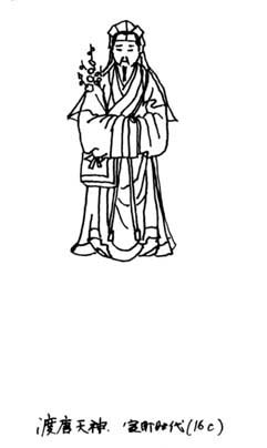 During the early Muromachi period, paintings of Tenjin, dressed in Chinese scholar's robes, were produced in great numbers. Typically, the paintings show Teinjin standing frontally against a neutral background, and often include a poetic inscription. The theme was a favorite of the early 17th-century courtier Konoe Nobutada 近衛信尹 (1565-1614) who painted distinctive images of Totō Tenjin with a minimum of thick ink strokes.