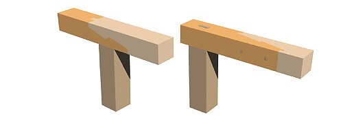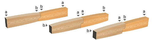 2 To join timbers end to end to increase their length; end or butt joints. Japanese joinery is divided broadly into two basic types: butt or straight joints, tsugite, and angle joints *shiguchi 仕口. Consideration must be given to parts of the tree from which the timber has been cut. There are three basic arrangements: a) yukiaitsugi 行合継, to join timber ends which were both close to the top of the trunk sueguchi 末口; b) wakaretsugi 別継, to join ends from the base of the trunk motoguchi 元口; c) okuritsugi 送継, to join two timbers, one end of which came from the upper part of the trunk and the other from the base. It is also important to note the location of the jointed member in relation to the timber to which it is attached: *shintsugi 真継, the joint itself is squarely set upon a supportive member such as a pillar; mochidashitsugi 持出継, the joint itself is in part of the member which extends beyond the supportive timber. This results in a certain weakness in the jointed member. Finally, the most fundamental methods of joinery include: a) kirikumitsugi 切組継, a joint dependent upon tenon *hozo ほぞ, and mortise *hozoana ほぞ穴; b) *koshikaketsugi 腰掛継, a lapped joint; c) soegi itatsugi 添木板継 or soegitsugi 添木継, a splint or brace joint; d) *sogitsugi 殺継, a scarf joint.