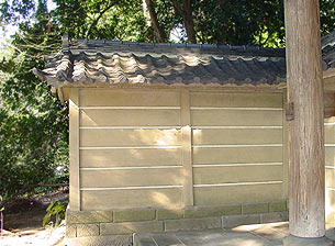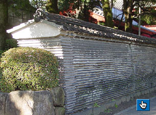 Also called tsuijibei 築地塀; tsuigaki 築垣 or 築墻. A formal style fence made by pounding a mixture of mud and clay between wooden frames *seki-ita 堰板. The process used to make a fence tsuiji, is called *hanchiku 版築. Slanted posts *subashira 須柱, are set 1.8-2 m apart so that the fence, as seen in cross section, is broader at the base than at the top. The horizontal timbers that run between these posts are called jōgisuji 定規筋. The posts at each end are called kaigatabashira 貝形柱. Usually, a tiled *kawara 瓦, gable roof *kirizuma yane 切妻屋根 is constructed on top of the most formal type of fence. Cypress bark *hiwadabuki 桧皮葺 roofing was sometimes used. Mud fences without a wooden framework or a roof but reinforced with broken rock tiles, are called *dobei 土塀. Sometimes boards were used to cover the top of a simple mud fence. These are called agetsuchi tsuiji 上土築地. Sujibei 筋塀 are fences decorated with tile fragments and white lines, placed near the joints of the boards that support the pounded mud-clay. Five parallel white plaster lines signify nobility and monzeki ji-in 門跡寺院, to which a member of the imperial family has retired. A *neribei 練塀 fence is constructed with alternate layers of dried clay bricks and kneaded mud. It is sometimes made of boards with only the front side plastered. A large tsuiji is called *ōgaki 大垣. The earliest extant tsuiji dates from the Kamakura period. An example exists at Nishi no Miya Jinja 西宮神社 in Hyōgo Prefecture.
