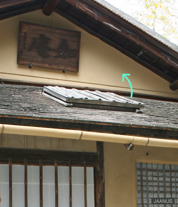 Skylights are placed on the sloping roof above the host's mat *temae datami 点前畳, above the guest's mat *kyaku datami 客畳, sometimes above the hard-packed earthen floor *doma 土間, and on the interior side of a pent roof with a long eave nokibisashi軒廂. Some tea ceremony houses have two skylights.