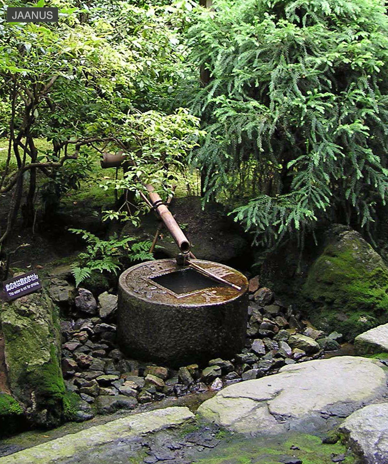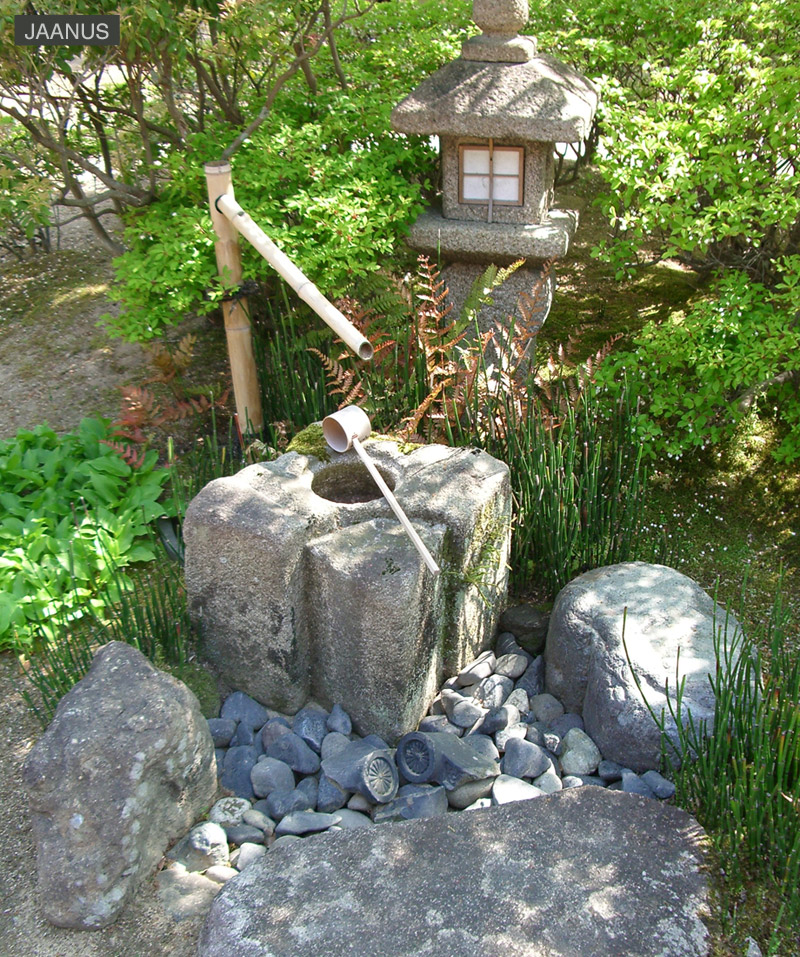 A stone with a depression may serve as a wash basin, and a ladle is sometimes provided for the guest's use. Sometimes the water is poured into the basin from a bamboo conduit that stops and starts the flow of water depending on the weight of the water flowing into it. A lantern is placed nearby and stones with various roles *yaku-ishi 役石, are often arranged around the tsukubai.