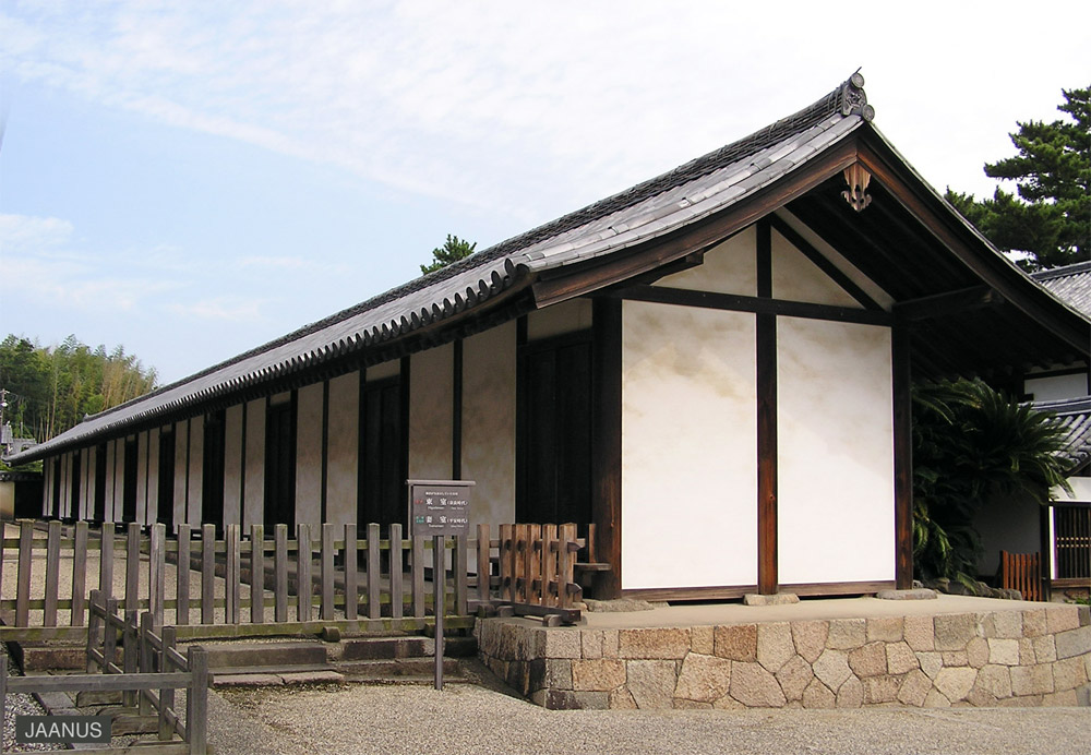 The dormitory for ordinary attendant monks at Hōryūji 法隆寺 in Nara. The present Tsumamuro was constructed in the Heian period, ca. 1121, and was first repaired in 1246. Over the centuries, it underwent various repairs, but in 1962 was reconstructed closely to its 1246 form.