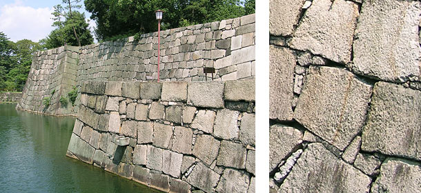 Lit. "pounded and inserted stone joinery." The most common stone work technique used to build a dry construction castle wall *ishigaki 石垣. Each surface of the individual stone is roughly beaten and broken so that it can be inserted into the rough and uneven face of the wall. It is different than *kirikomihagi 切込矧ぎ, cut and inserted masonry, where the individual stones are carefully hewn with straight lines and laid in neat rows. Uchikomihagi is used because it is an easier and faster construction technique.