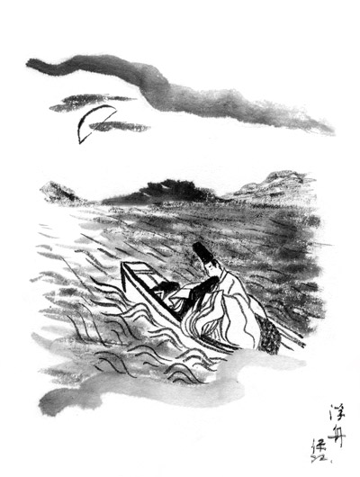 4 Niou taking Ukifune, dressed in white, to the house of the governor of Inaba 稲葉 across the river, where they watch the setting sun and write poems.