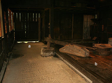 1 An alternative term for all or part of the earth-floored area, *doma 土間 or *niwa 庭, in farmhouses nōka 農家 of the Edo period. Called usuniwa (mortar yard), because the mortar or hand mill usu 臼 for pounding rice was often kept and used there. In farmhouses in Mie, Hiroshima, and Shimane Prefectures, usuniwa referred to the front half of the earth-floored area, which was used as an agricultural workspace. On Izu Miyakejima 伊豆三宅島, it is pronounced usunyaa うすにゃあ.