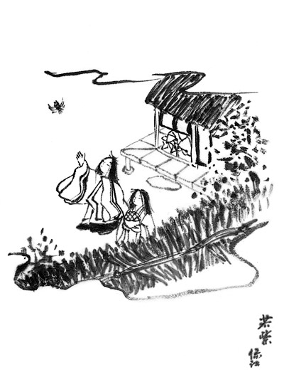 Lit. "young lavender." A pictorial subject based on "Wakamurasaki" ("Lavender"), Chapter 5 of Genji monogatari 源氏物語 (The Tale of Genji). In this chapter, Genji goes to the northern hills to have prayers said for his recovery from a long debilitating illness, and chances upon a learned prelate sōzu 僧都. While at the mountain temple, he peeps through a wattle fence and sees a young girl (Murasaki no Ue 紫の上) crying over her pet baby sparrows that have gotten loose. The girl's features resemble Fujitsubo 藤壷, consort of his father, the emperor, with whom Genji had fallen in love and had a brief secret affair (see *Kiritsubo 桐壷) and whose niece the girl turns out to be. Half a year later Genji finally abducts Murasaki to raise her himself.