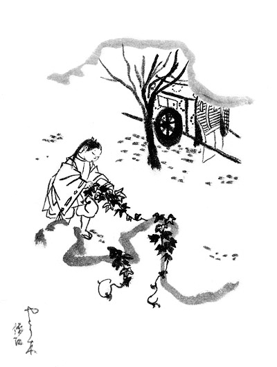 Scenes chosen for illustration include: Kaoru playing a game of go 碁 with the emperor who obliquely offers him the hand of his daughter; Kaoru, about to go by carriage to visit Naka no kimi, standing in his garden where morning glories asagao 朝顔 and maiden flowers nadeshiko 撫子 are blooming; Niou playing a lute biwa 琵琶 beside the pregnant Naka no kimi, who leans against an armrest and likens her half-abandoned state to the autumn grasses in the garden below. Three scenes from this chapter, the go game between Kaoru and the Emperor, Niou and Roku no kimi on the third morning after consummating their marriage, and Niou playing a lute beside Naka no kimi, are found in the earliest extant illustrated version (12th century) preserved by the Tokugawa 徳川 Art Museum in Aichi Prefecture.