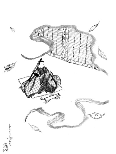 A pictorial subject based on "The Flute," Yokobue, Chapter 37 of Genji monogatari 源氏物語 (The Tale of Genji). The flute belonged to the late *Kashiwagi 柏木, actual father of Kaoru 薫 by the Third Princess, Onna San no Miya 女三宮 (see *Wakana 若菜), Genji's wife and now a nun. Scenes chosen for illustration from this chapter include: the Third Princess receiving a letter with bamboo shoots and taro roots from her father, the retired Emperor Suzaku 朱雀, in the spring; the following scene, with the baby Kaoru teething on one of the bamboo shoots as Genji looks on; *Yūgiri 夕霧 (Genji's son), meanwhile continues his restrained courting of Kashiwagi's widow, the Second Princess, Ochiba no Miya 落葉宮, and one autumn evening, after listening to the Second Princess play the Chinese harp sō 箏 and her mother the lute biwa 琵琶, the princess gives him the late Kashiwagi's flute. Another scene (found in the earliest 12th-century illustrated version owned by the Tokugawa 徳川 Art Museum) depicts a whispered conversation between Yūgiri and his jealous wife Kumoi no kari 雲井雁 after Yūgiri's late night return from meeting Princess Ochiba which has disturbed the household. Kumoi no kari is calming one of their brood who is crying because his mother has no milk and cannot nurse him.