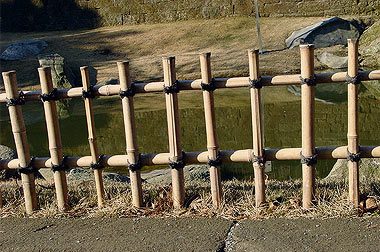 Lit. "four-eyed fence." A generic name for a bamboo lattice fence. The poetic name derives from the quadrant of lozenge shapes created by the lattice pattern. Typically green, long-jointed bamboo are arranged vertically and horizontally and tied with cord. Bamboo, cedar or cypress are placed at intervals of 1 to 8 m, and the fence rarely exceeds one meter height. Yotsumegaki usually are employed as *ōgaki 大垣, partitioning the inner and outer precincts of a tea garden *roji 露路. In many cases small shrubs are planted along the base of the fence or climbing plants are trained to trail along the yotsumegaki. Variants include the curving *kōetsujigaki 光悦寺垣 and the midare 乱れ or sōsaku 創作 yotsumegaki in which there is no fixed pattern .