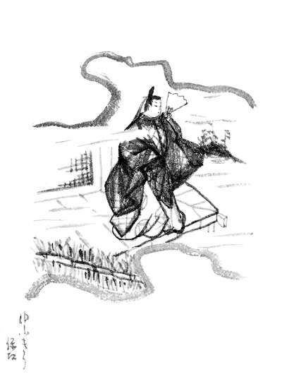 A pictorial subject taken from the "Evening Mist" Yuugiri, Chapter 39 of Genji monogarari 源氏物語 (The Tale of Genji). Yuugiri is the son of Genji and his first wife *Aoi 葵, and the husband of Kumoi no kari 雲井雁 (see *Fuji no uraba 藤裏葉): this chapter concerns Yūgiri's increasing infatuation with and eventual seduction of the Second Princess, Ochiba no Miya 落葉宮, the widow of *Kashiwagi 柏木. Jealous, his wife Kumoi no kari retreats back to her father's house. The two episodes frequently chosen for illustration are: the jealous Kumoi no kari coming upon Yūgiri from behind to snatch away a letter she thinks is from the Second Princess; and Yūgiri visiting the princess at her Ono villa, Ono sansō 小野山荘, standing at the veranda railing and looking at the fall landscape with fan raised to his eyes. The first episode is illustrated in a section of the earliest extant version (early 12th century) in the Gotō 五島 Museum.
