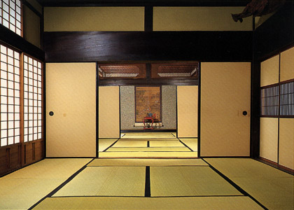 A generic term for a room covered with straw mats *tatami 畳. In the Heian period when aristocratic dwellings *shinden-zukuri 寝殿造 were floored with wooden planks, woven straw or rush mats, some with bound edging, and thick mats agedatami 上畳 that raised the person a little above floor level were used for seating. Eventually, from the late 12th century, the word zashiki applied to rooms completely covered with straw mats and was used for guests. Thus, it became a reception room or guest room. This custom was later emulated in the folk dwellings *minka 民家 of lower ranking people in the Edo period. Both *sukiya 数寄屋 and *shoin 書院 later came to use not only tatami but also incorporated alcoves (both *tokonoma 床の間 and *wakidana 脇棚) in the zashiki.